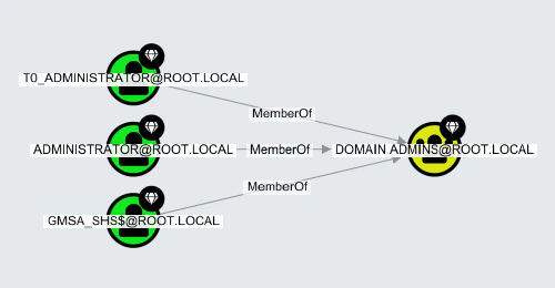 Applies to BloodHound Enterprise and CE For example, the image below shows three User nodes (left side) connected to one Group node (right side), via the “MemberOf” edge, indicating the three users belong to the group: